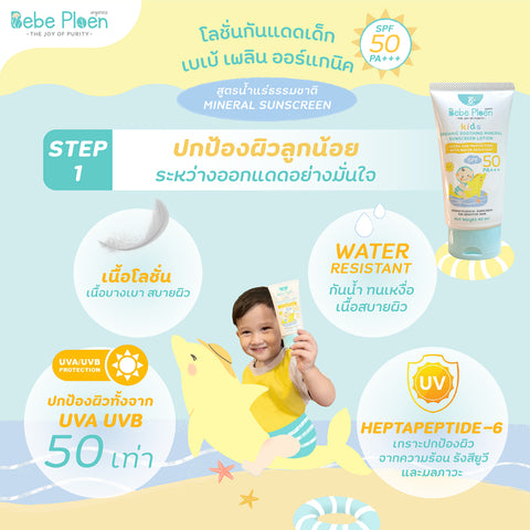 Children's sunscreen lotion with Mineral Sunscreen, light texture, fast absorption, effectively protects skin from UVA and UVB rays with SPF50 PA+++. With natural innovation Heptapeptide-6, it helps protect skin from temperature changes when exposed to heat from sunlight and natural extracts of bilberry and rosemary. Helps restore and balance the skin to be strong from UV rays and pollution and extracts from beetroot, vitamin B5 add moisture to the skin. It also contains organic chamomile and aloe vera extracts that soothe and prevent irritation caused by sun exposure, restoring skin to a healthy, naturally radiant complexion.