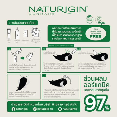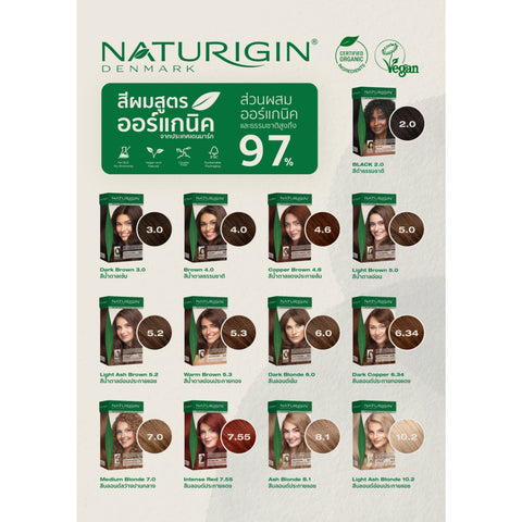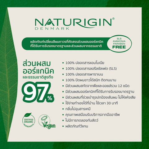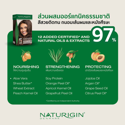 NATURIGIN Dark Coffee Brown 3.0 เปลี่ยนสีผมให้เป็นสีน้ำตาลกาแฟเข้ม ครีมเปลี่ยนสีผมที่ได้รับการพัฒนาสูตรด้วยเทคโนโลยีทันสมัย โดดเด่นด้วยส่วนผสมออร์แกนิคจากเลมอนและเอสเซนเชียลออยล์จากส้มแมนดาริน และเสริมด้วยสารสกัดออร์แกนิคบริสุทธิ์และน้ำมันสกัดจากพืชธรรมชาติอีก 10 ชนิด เพื่อทำหน้าที่ปกป้องบำรุงเส้นผมระหว่างการทำสีและเพิ่มความเงางาม เป็นสูตรที่ปราศจากแอมโมเนีย, ปราศจากพาราเบน, ปราศจากสารเรซอซินอล และ ปราศจากสาร SLS สามารถปิดผมขาวได้ 100%