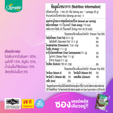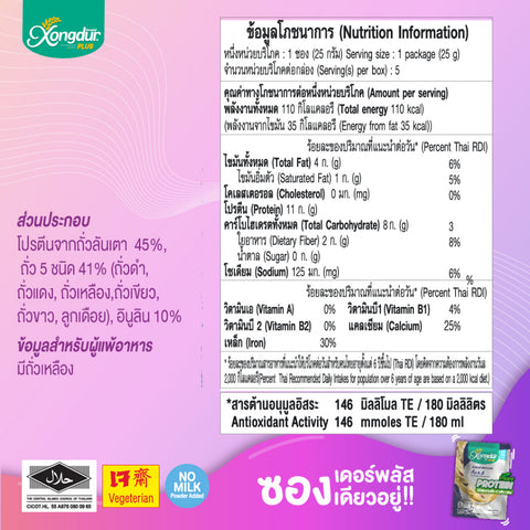 Xongdur Plus Plant Base Pea Protein No sugar Protein 11g (25 g x 5 Sachets) ซองเดอร์ พลัส เครื่องดื่มโปรตีนถั่วลันเตา ไม่มีน้ำตาล โปรตีน 11ก.