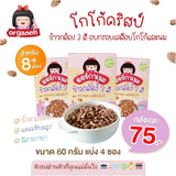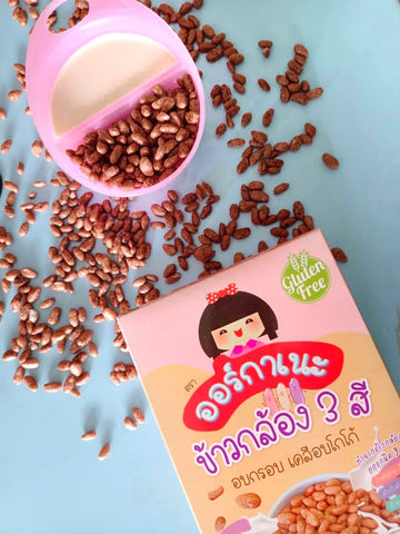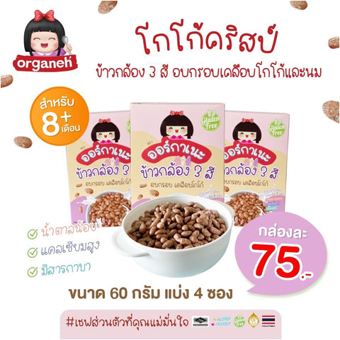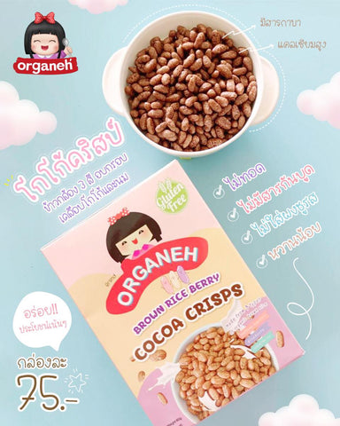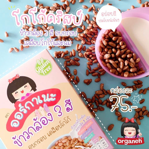ออร์กาเนะ โกโก้ คริสป์ ทำจากข้าวกล้องหอมมะลิ ข้าวสังข์หยด และข้าวไรส์เบอรี่ และข้าวโพดหวาน เคลือบด้วยโกโก้แท้ผสมนมวัว