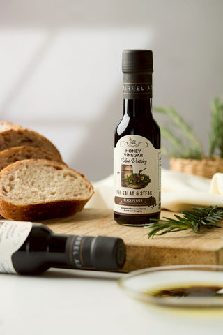 Honey Vinegar Salad Dressing is crafted through a unique process where honey is fermented and aged in oak barrels, resulting in a slightly thick, viscous texture. With its tangy flavor profile and 5% acidity level plus hot chili for a subtle spicy finish this premium dressing is perfect for drizzling over salads or pairing with steak.