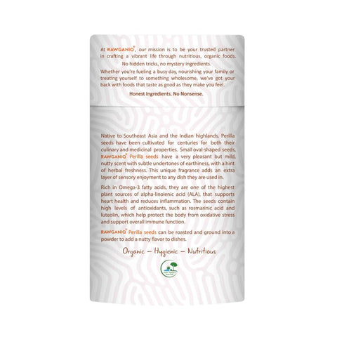 Native to Southeast Asia and the Indian highlands, Perilla seeds have been cultivated for centuries for both their culinary and medicinal properties. Small oval-shaped seeds, RAWGANIQ Perilla seeds have a very pleasant but mild, nutty scent with subtle undertones of earthiness, with a hint of herbal freshness. This unique fragrance adds an extra layer of sensory enjoyment to any dish they are used in.