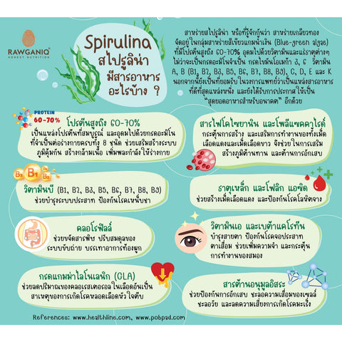 สาหร่ายสไปรูลิน่า หรือที่รู้จักกันว่า สาหร่ายเกลียวทอง สาหร่ายสไปรูลิน่าเป็นโปรตีนสมบูรณ์ (Complete Protein) โดยมีโปรตีนสูงถึง 60-70 % ของน้ำหนักแห้ง มีกรดอะมิโนมากถึง 18 ชนิด สาหร่ายสไปรูลิน่าอุดมไปด้วยธาตุเหล็ก เบต้าแคโรทีน คลอโรฟิลล์ สารต้านอนุมูลอิสระ และกรดไขมันโอเมก้า 3 & 6 ควบคู่ไปกับแคลเซียม แมกนีเซียม โพแทสเซียม ทองแดง และฟอสฟอรัส นอกจากนี้ ยังมีวิตามินบี5 บี1 บี2 บี3 บี12 และวิตามินอี