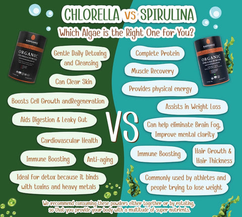 - Detoxification Support : Both Green Spirulina and Chlorella have detoxifying properties that aid in eliminating toxins and heavy metals from the body. They support healthy liver function and promote overall detoxification processes.