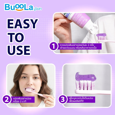 บูโอล่า เพอร์เพิล ไวท์เทนนิ่ง ทูธเพสท์ ยาสีฟันเนื้อเจลสีม่วง สูตรโซเดียม ฟลูออไรด์ 1000 ppm ช่วยดูแลเคลือบผิวฟันและช่วยลดความเสี่ยงของการเกิดฟันผุ พร้อมลดการสะสมของคราบพลัค คราบหินปูน และแบคทีเรียในช่องปาก ช่วยลดเลือนคราบเหลืองสะสม ให้ฟันดูสะอาดและสว่างขึ้น ฟองนุ่ม แปรงลื่น กระจายตัวง่าย มอบลมหายใจหอมสดชื่น พร้อมช่วยลดกลิ่นปากระหว่างวัน