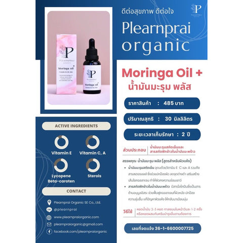 Plearnprai Organic เพลินไพร ออร์แกนิค เซรั่มน้ำมันมะรุมสกัดเย็นบำรุงผิวหน้า และสารสกัดฟักข้าว Moringa Oil Plus+ Gac Fruit Extract (30 ml)