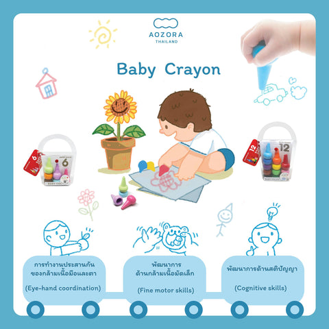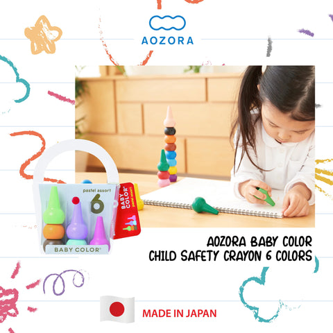 Aozora Baby Crayon สีเทียนรูปทรงกรวย 6 สี (พลาสเทล) สามารถให้เด็กนำมาขีดเขียน ระบายสี เล่นเกมส์ทายสี หรือนับตัวเลข และเรียงต่อขึ้นไปเป็นชั้นๆ สีเทียนปลอดสารพิษ (Non-Toxic) สำหรับลูกรัก นำเข้าจากญี่ปุ่น ที่เด็กๆ จะได้วาดเส้น และระบายสีอย่างอิสระด้วยสีเทียนแบบเต็มแท่ง เนื้อสีแน่น แข็งแรงทนทาน ไม่เปราะหักง่าย ไร้กังวลเรื่องความปลอดภัย