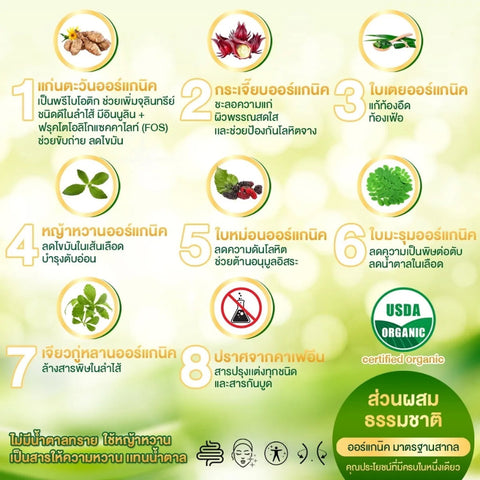 Selected organic herbs complete with all ingredients to detoxify, safe, confident, grown using organic farming methods, no toxins, no chemicals, suitable for health care workers. The outstanding herb is Organic Sunflower. Contains important substances: Inulin, Fructo Oligosaccharite (FOS) relieves constipation, difficult bowel movements, flatulence, insomnia, suitable for those who want to increase immunity and those who want to take care of their figure.