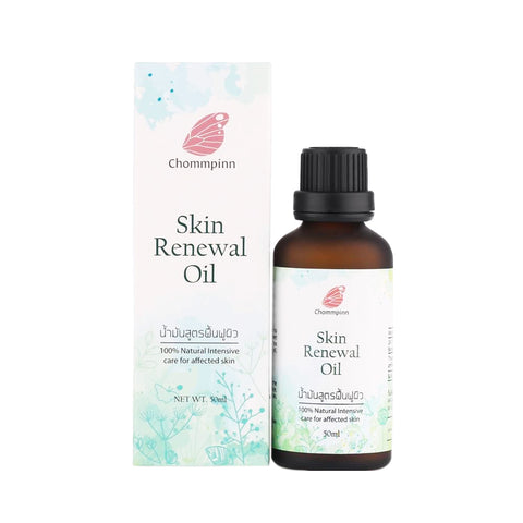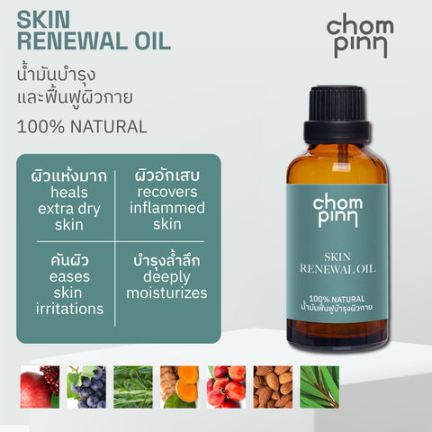 น้ำมันฟื้นฟูผิวสูตรเข้มข้นพิเศษธรรมชาติ 100% สำหรับบำรุงผิวแห้งคันและแพ้ง่ายจากการพิสูจน์คุณค่าและผลลัพธ์มหัศจรรย์ของน้ำมันธรรมชาติและน้ำมันหอมระเหยบริสุทธิ์นานาชนิด สู่ความรักและศรัทธาต่อทุกหยดที่กลั่นมาจากพลังชีวิตของพืชพรรณ ชมภิญญ์ตั้งใจผลิต Skin Renewal Oil ขวดนี้ด้วยการคัดสรรน้ำมันธรรมชาติและน้ำมันหอมระเหยจากพืชที่เปี่ยมด้วยสารอาหารผิว เช่น วิตามินอี และสารต้านอนุมูลอิสระ และมีฤทธิ์ต้านการอักเสบของผิวในระดับสูง มาผสมผสานเป็นสูตรพิเศษ เพื่อเป็นมอยเจอไรเซอร์ที่ดูแลผิวที่แตกแห้ง คัน และมีปัญหาได้อย่างมีประสิทธิภาพ ให้คุณสัมผัสการเปลี่ยนแปลงเชิงบวกตามวิถีธรรมชาติอย่างยั่งยืน