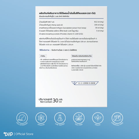 Diip ผลิตภัณฑ์เสริมอาหาร ซี.บี.ดี ผสมน้ำมันเอ็มซีทีเเบบหยด สูตรทุกเวลา C.B.D Oil Plus MCT Oil Dropper - Daily Oil (30ml)
