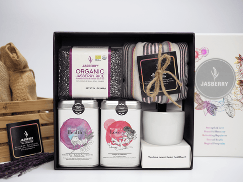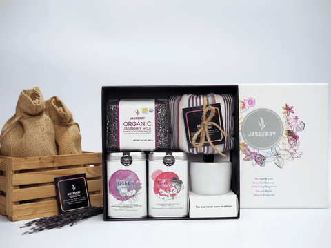 Jasberry ชุดของขวัญ เซตข้าว, ชาออร์แกนิค 2 กระป๋อง, ถ้วยชาเซรามิก และผ้าพันคอทอมือ ชุด C-03 Gift Set Jasberry Rice + 2 Organic Herbal Tea Blend + Ceramic Mug + Traditional Scarf (1500 g)