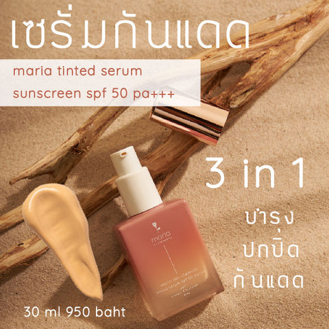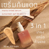 Maria tinted serum non-sunscreen spf 50 pa+++ เซรั่มกันแดดลดสิว สิวลดลง ไม่อุดตัน ผสานเทคโนโลยี กันน้ำ กันเหงื่อ กันแดด ปกปิดดี บางเบา ติดทน สูตรอ่อนโยน เหมาะสำหรับ ผิวแพ้ง่าย ผิวเป็นสิว ปิดรอยสิว รักษาสิว ธรรมชาติ Natural Charming Longwear Sunscreen Vegan วีแกน