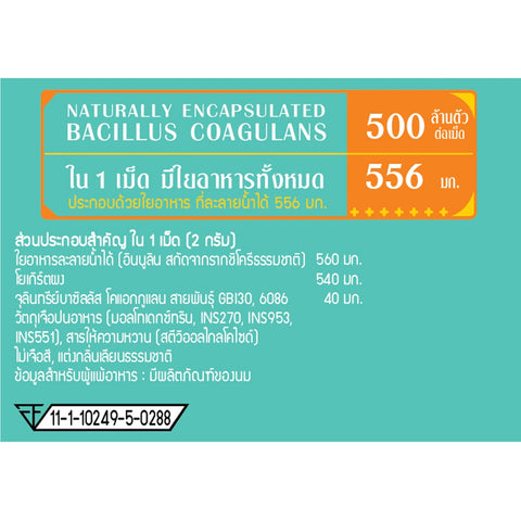 - เปอร์เซ็นต์รอดไปถึงลำไส้ได้มากกว่า 78% เมื่อเทียบกับโพรไบติกบางสายพันธุ์ที่มีในโยเกิร์ตบางยี่ห้อ