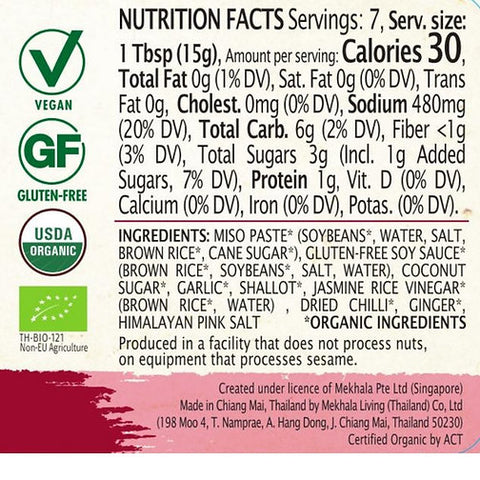 Ingredients: Miso Paste* (Soybeans*, Water, Salt, Brown Rice*, Cane Sugar*), Gluten-Free Soy Sauce* (Brown Rice*, Soybeans*, Salt, Water), Coconut Sugar*, Garlic*, Shallot*, Vinegar* (Brown Rice*, Water) , Dried Chilli*, Ginger*, Himalayan Pink Salt