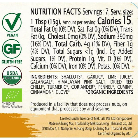 หอมแดง*, กระเทียม*, น้ำมะนาว*, ข่า*, เกลือหิมาลัย, พริกแดงแห้ง*, ขมิ้น*, เครื่องเทศ*