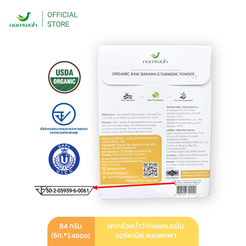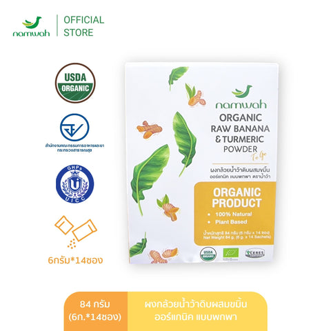 Namwah ผงกล้วยน้ำว้าดิบผสมขมิ้นออร์แกนิค แบบพกพา ตราน้ำว้า Organic Raw Banana & Turmeric Powder (ToGo) (14 x 6g)