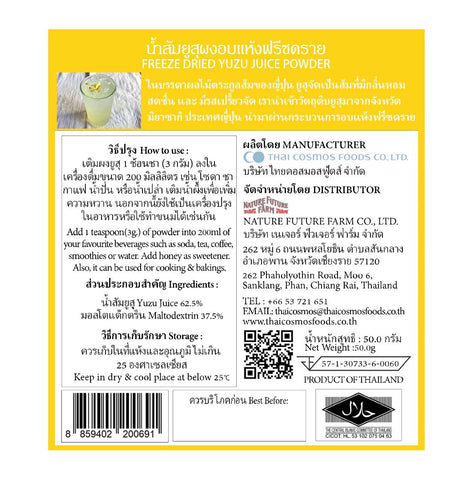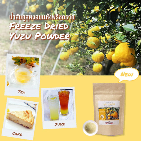 ส่วนประกอบสําคัญ Ingredients : นํ้าสัมยูสุุ Yuzu Juice 62.5%, มอลโตแด็กตริน Maltodextrin 37.5%