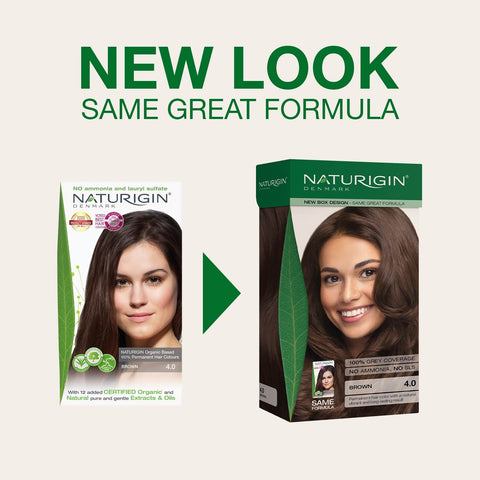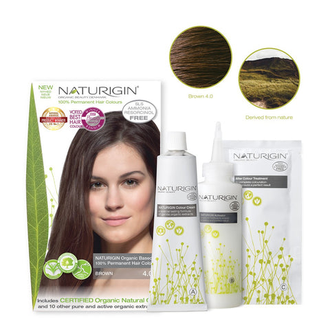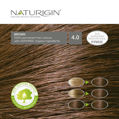 NATURIGIN Brown 4.0 gives the hair a natural and shiny brown colour. An advanced naturally derived formula, with a unique blend of certified organic lemon and mandarin essential oils, as well as 10 other pure and gentle organic extracts and natural oils that protects the hair during colouring and adds shine and nourishment to the hair. This hair colour is completely free of ammonia, parabens, resorcinol and SLS, and covers grey hair up to 100%.
