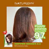 NATURIGIN Copper Brown 4.6 changes hair color to copper brown with red-orange pigments. Gives a warm brown color effect. Hair coloring cream that has been formulated with modern technology. Features organic ingredients from lemons and essential oils from mandarin oranges. and supplemented with pure organic extracts and oils extracted from 10 natural plants. To protect and nourish the hair during coloring and add shine. It is a formula without ammonia, without parabens, without resins, and without SLS. It can cover white hair 100%.