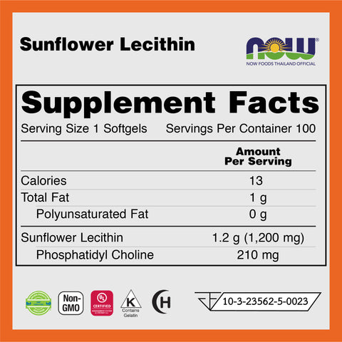 Now Foods Sunflower Lecithin 1200 mg. (100 Softgels) ผลิตภัณฑ์เสริมอาหาร เลซิติน จากดอกทานตะวัน 1200 มก. (100 ซอฟเจล)