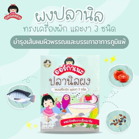 ปลานิลผงสูตรทรงเครื่องผักและงา3ชนิด ด้วยส่วนผสมของผงปลานิล, งาดำ/งาขาว, งาม้อน, มะเขือเทศ, ข้าวโพดหวาน, จมูกข้าวสังข์หยด, ตำลึง และหอมหัวใหญ่ อร่อยลงตัวและคุณค่าสารอาหารจากเนื้อปลาอุดมด้วยโปรตีนสูงและย่อยง่าย และส่วนผสมที่บำรุงเส้นผมผิวพรรณและบรรเทาอาการภูมิแพ้ มีโอเมก้า3 เสริมสร้างภูมิคุ้มกัน