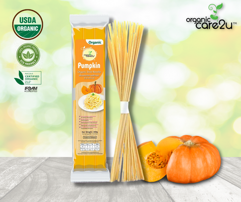ผลิตจากแป้งสาลีออร์แกนิค ไม่ฟอกขาว ไม่ขัดสี และฟักทองออร์แกนิค เส้นอร่อย เหนียวนุ่ม มีสีเหลืองทองสวยงาม น่ารับประทาน พร้อมกลิ่นฟักทองอ่อนๆ ไม่เหม็นเขียว ให้คุณค่าทางโภชนาการ พร้อมประโยชน์จากฟักทองช่วยบำรุงสายตา ปกป้องผิว และเพิ่มภูมิคุ้มกันในร่างกาย