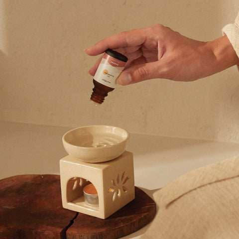 1. หยดน้ำมันหอมระเหย 5 หยดลงในเตาน้ำมันเพื่อกระจายกลิ่น (ขึ้นอยู่กับขนาดห้อง) เบสออยล์ 50 มล. 5 หยด