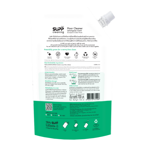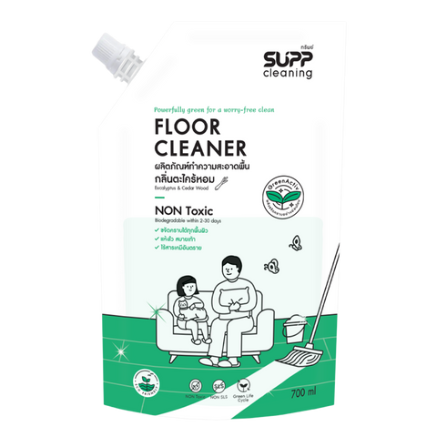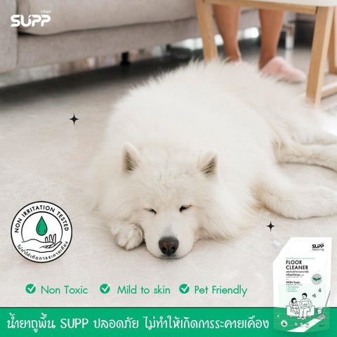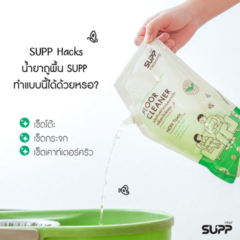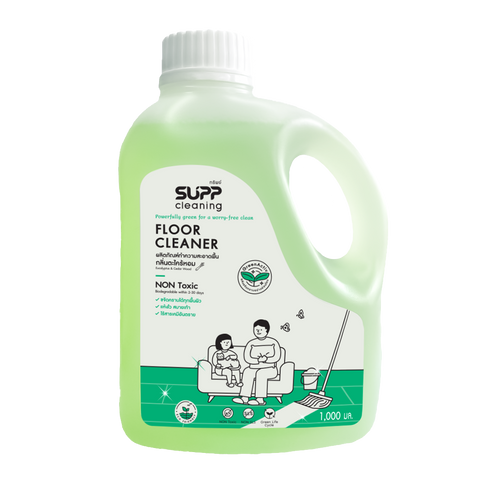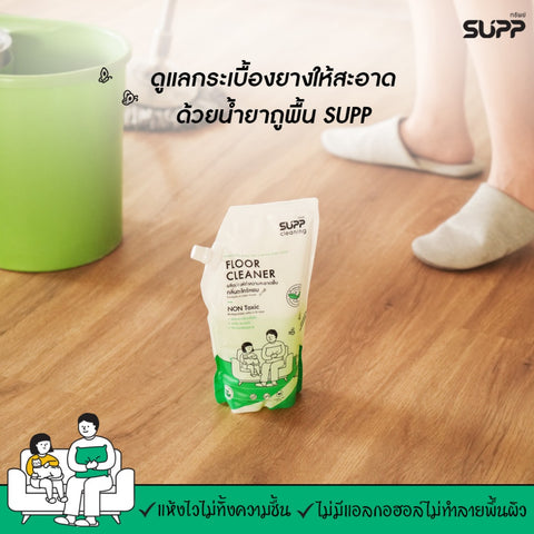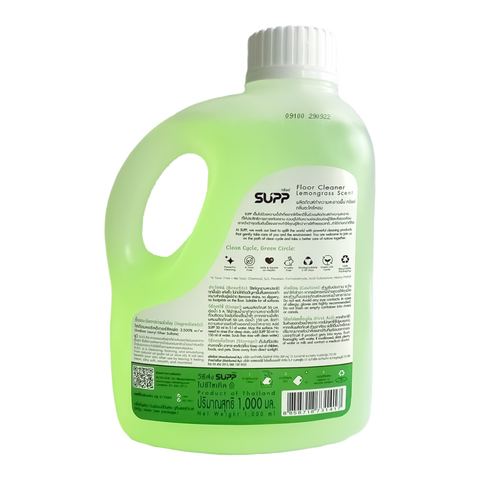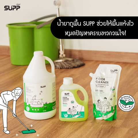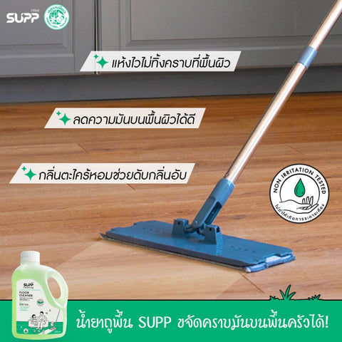 ผลิตภัณฑ์ถูพื้น SUPP มาตรฐานฉลากเขียว กลิ่นตะไคร้หอมสกัดจาก Essential Oil ผลิตภัณฑ์จากพลังธรรมชาติ ที่มาพร้อมประสิทธิภาพและความปลอดภัยในการใช้งานจากนวัตกรรม GreenActiv เฉพาะของแบรนด์ ใช้ขจัดคราบสกปรกได้กับทุกพื้นผิว แห้งเร็ว พื้นไม่เหนียว ไร้คราบ ไม่ต้องถูซ้ำให้เมื่อยแขน หมดปัญหาเป็นรอยเท้าและพื้นลื่น ส่วนประกอบหลักผลิตจากสารสกัดน้ำมันธรรมชาติ (น้ำมันปาล์ม, น้ำมันมะกอก) และปราศจากสารเคมีอันตราย ผ่านการทดสอบ Non Irritation และ Mild to skin ไม่ทำให้ให้เกิดการระคายเคืองและมีความอ่อนโยนกับผิวเทียบเท่าน้ำ อ่อนโยนต่อเด็กและสัตว์เลี้ยง